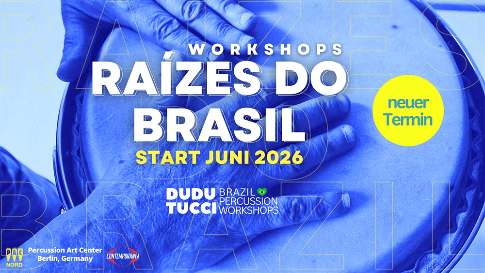 | FORTBILDUNGSPROJEKT 22 (2026-2028) Raízes do Brasil Fortbildung in afrobrasilianischer Percussion mit Dudu Tucci Startmodul: 04.06. – 07.06.2026 Alle, die die Fortbildung schon mal durchlaufen haben und ihre Kenntnisse mit aktuellen Techniken und Informationen wieder auffrischen möchten, können gerne auch einzelne Module der Fortbildung buchen. Die Fortbildung findet im PAC NORD Berlin statt von Donnerstag bis Sonntag. |